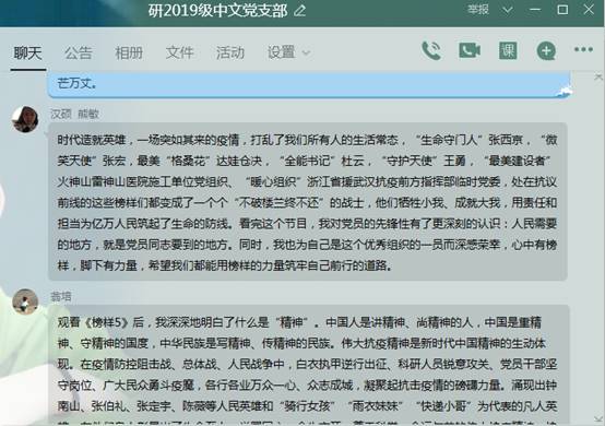 2021年4月6日下午7:30,研2019级中文党支部线上开展《榜样5》学习活动,党员在线下自主观看《榜样5》后,在支部群内交流分享心得感受,此次会议由支部书记何佳同志主持。