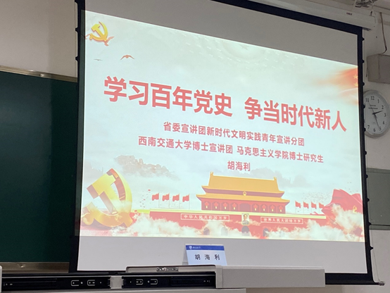 紧接着,胡海利博士为同学们厘清了学习党史的重要性,强调学习百年党史能够帮助青年学生感悟真理力量、坚定信仰信念、牢记初心使命、保持昂扬精神。