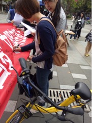 用车完毕后打乱密码”等几条倡议深得大家赞赏。机械学院的尹同学说,“你们这几条倡议很好,我觉得如果大家都能做到这些,那咱们的校园环境会更加文明!”在邀请这位同学志愿签名时,他还说自己回去要向同学宣传文明使用共享单车。