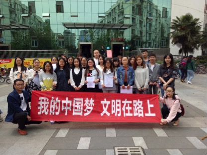 2016硕士中文党支部20名党员在学校三食堂门前开展了“我的中国梦,文明在路上”公益宣传活动,向同学们介绍文明使用共享单车的意义,说明使用共享单车的注意事项,并邀请同学们进行志愿签名。
