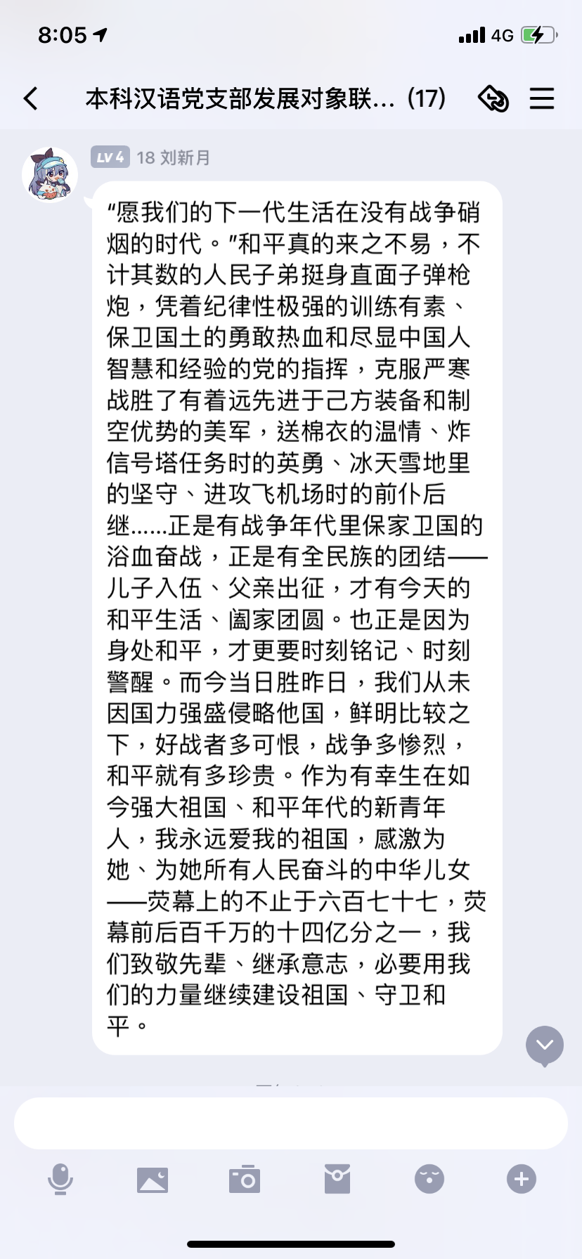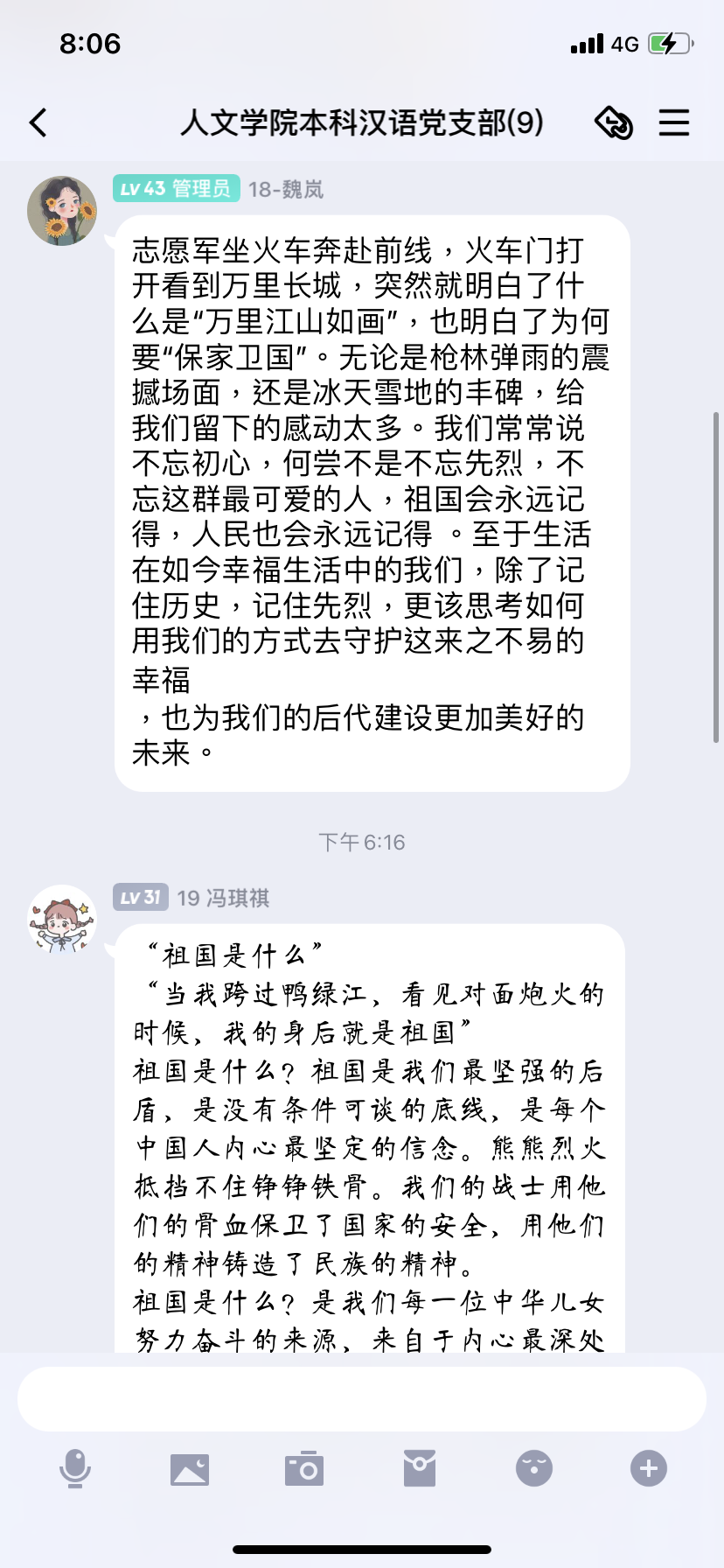 观影结束后,支部成员就《长津湖》展开了激烈的讨论与交流。魏岚同志感叹道:“我们常常说不忘初心,这何尝不是不忘先烈,不忘这群最可爱的人。祖国会永远记得,人民也会永远记得!至于生活在如今幸福生活中的我们,除了铭记历史,缅怀先烈,更应该思考如何用我们的方式去守护这来之不易的幸福,也为我们的后代建设更加美好的未来。”刘新月同志发表了自己的看法:“正是有战争年代里先烈们保家卫国的浴血奋战,正是有全民族的团结——儿子入伍、父亲出征,才有今天我们的和平生活与阖家团圆。也正是因为我们身处和平,才更应该时刻铭记历史、时刻警醒自身。”史可心同志表示,正是先烈们以血肉之躯筑起了我们中华民族新的长城,换来了今天没有硝烟的幸福生活,换来了我们如今的盛世。铭记历史,缅怀先烈,后世的我们更应自强不息,牢记使命。