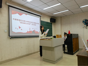 本科音乐党支部为贯彻落实“我为师生办实事”主题活动,通过歌唱体验音乐涵养,发展人文情怀与审美情趣,联合传播教师党支部于2021年11月4日下午13:30在音专三教室开展流行歌曲教唱活动。此次活动由徐奧雯同志主持,周昕瑜同志主讲。
