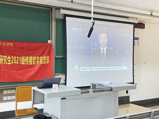 2021年12月2日下午13:00,研究生2021级传播哲学党支部在九里校区4422教室举行中国共产党第十九届中央委员会第六次全体会议精神专题学习会,本次学习由研究生2021级传播哲学党支部书记陈子龙同志主持,支部共24名党员及入党积极分子参加学习,学习会分为共同观看《中国共产党第十九届中央委员会第六次全体会议公报》全文播报视频及支部同志分享学习感想两个部分。