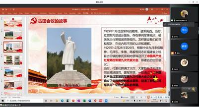 2021年12月9日下午4:00,本科汉语党支部依托“腾讯会议”APP,线上组织开展献礼中国共产党成立100周年系列活动——家乡红色基地打卡汇报,此次汇报由第六小组负责,汇报共分为三个部分。本次会议由魏岚同志主持,支部全体成员参与学习。