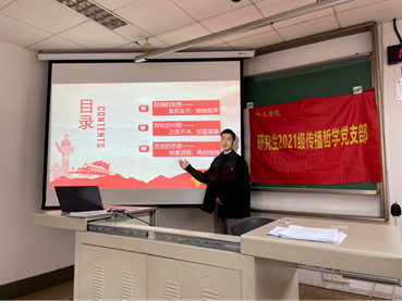 学习完毕,党支部书记陈子龙同志代表支部委员会针对党支部既往开展的相关工作进行年度述职。内容包括党支部前期取得的成绩、存在的问题以及下一年度的工作思路。党支部在上一学期完成了新生党员组织关系转入、积极分子发展党员的接续考察等基础性工作,还结合专业所长,策划多种形式的活动,推进党建工作与专业实践融合发展。陈子龙同志表示,2022年度的工作思路大致分为三个方面,分别是强化党建工作重要性的认识、加强支部自身建设以及规范支部党建工作的开展。