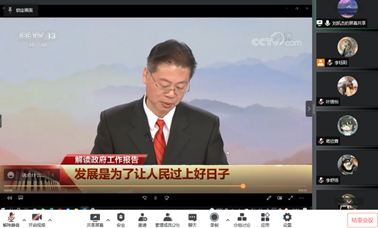 然后,支部书记刘凯杰带领支部成员观看关于两会精神的解读视频,学习两会内容和精神。全体党员在政府工作报告起草组成员刘日红同志和特约评论员杨禹同志的解读中,围绕“贯彻党中央精神,提振预期信心”,“着力办好自己的事,诸多务实举措‘有的忙’”,“统筹稳增长,调结构,推改革”,“减税降费,公平普惠,直接有效”,“扩大内需,突出民生导向”,“把中国经济的韧性充分展现出现”,“发展是为了让人民过上好日子”,“尽力而为量力而行,扎实推进共同富裕”和“让中国市场成为世界的、共享的、大家的市场”等多个主题,对报告有了更加深入的了解,对政府工作报告有了更加深入的学习。