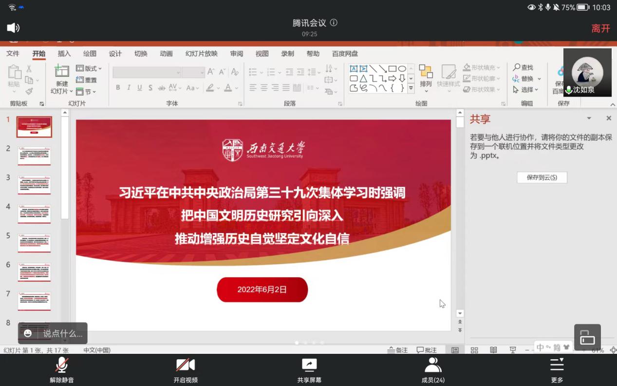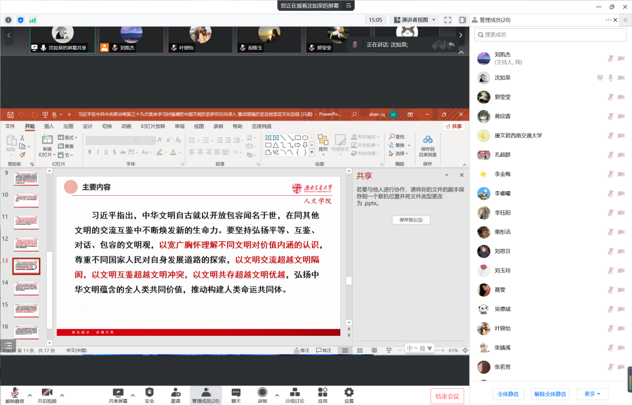 2022年6月17日上午十点整,为迎接宣传贯彻党的二十大工作,突出学习贯彻习近平新时代中国特色社会主义思想和习近平总书记关于教育的重要论述,学院沈如泉副院长受邀为研究生2021级中文党支部21名党员和8名入党积极分子以线上平台的方式讲授专题党课。本次党课学习文史相映,缀连古今,进一步促进支部成员对党史的了解和对中华文化的认同。