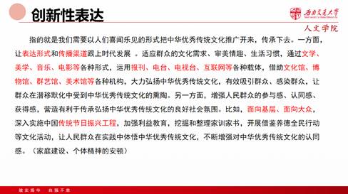 第一点是创新性。习近平总书记指出:“世世代代的中华儿女培养和发展了独具特色、博大精深的中华文化,为中华民族克服困难、生生不息提供了强大的精神支撑。”在新的历史起点上推进社会主义强国建设,需要推动中华优秀传统文化创造性转化、创新性发展,不断增强中华优秀传统文化的生命力和影响力,铸就中华文化新辉煌。李书记指出,作为中文专业的党员,我们要深入古典文献中、深入历史中史实中,扎实开展学理研究,结合时代需要对中华传统文化所蕴含的思想观念、人文精神、道德规范进行创造性转化和创新性发展。