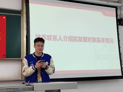 会议伊始,吴佳媛同志介绍本次大会的相关流程与内容。会议进入了第一个议程,首先宣读了此次拟发展对象推荐名单,他们分别是田雨彤、陈心玉、何璇祺、成佩峰以及魏欣妍同志。紧接着,五位同志的培养联系人对发展对象的日常考察情况进行总结,李文娟同志认为田雨彤同志能够在日常生活中严格要求自己,刻苦学习,符合成为发展对象的条件。白奇玉同志认为陈心玉同志思想品德端正,努力学习专业知识,服务同学,符合成为发展对象的条件。袁文林同志认为何璇祺同志在工作中肯于吃苦,甘于奉献,责任心强,符合成为发展对象的条件。乔真真同志认为成佩峰同志认真踏实,态度端正,积极参与组织生活,符合成为发展对象的条件。白奇玉同志认为魏欣妍同志在加强理论学习的同时,积极投身实践,不断完善自身能力素养,符合成为发展对象的条件。五位同志在日常生活中均能够发挥先锋模范作用,思想端正,作风优良,虽然在知识积累、实际经验方面尚存在些许不足,但基本符合了成为党员发展对象的条件。