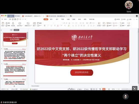 研2022级传播哲学党支部联动研2022级中文党支部在腾讯会议召开支部政治学习会议。会议由研2022级中文党支部李春雨同志主讲,两个支部的党员同志及入党积极分子参加学习。