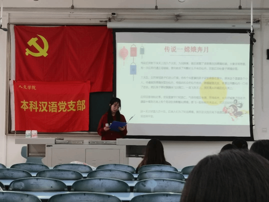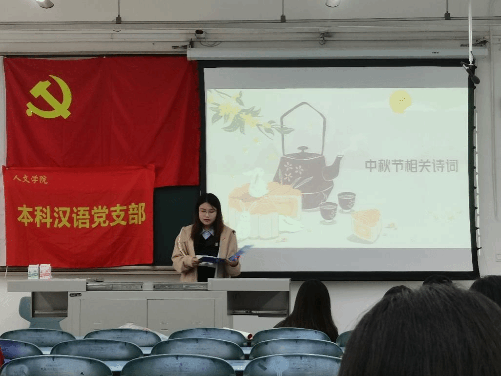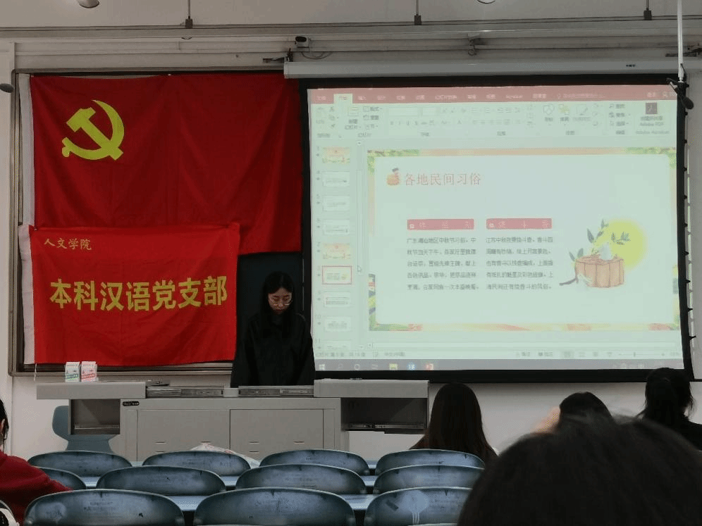 为弘扬中华优秀传统文化,本科汉语党支部于2023年10月12日下午4:20在X2226教室开展了中华传统节日分享活动。本次活动以“中秋节”为主题,涵盖了其由来、传说、习俗等各个方面的节日知识,由支部各小组代表轮流展示分享。本次活动由朱思颖同志领学,支部全体成员参加。