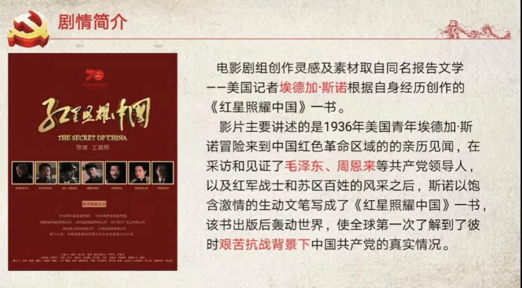 随后,贾璇琦同志针对《红星照耀中国》这部影片的角色和影响进行分析。在播放了电影的一些片段后,贾璇琦同志强调当时新生的中国共产党多次面临生死存亡的局面,但毛泽东、周恩来等领导人的睿智使中国共产党走上了正确的道路,中国共产党团结一切可团结的力量,带领中华民族进行着不屈不挠的顽强抗争。