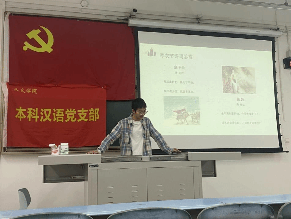 最后,第四小组的周子然同志带领大家一起对寒衣节的诗词进行赏析。“七月流火,九月授衣”,寒衣节历史悠久,涉及诗词众多。周子然同志向大家详细分析了许浑《塞下曲》、张纮《闺怨》、朱敦儒《十二时》等诗词。他引导支部同志关注寒衣节诗词忧愁、悲凉的基调氛围,点出中国“伤春悲秋”的诗歌传统。