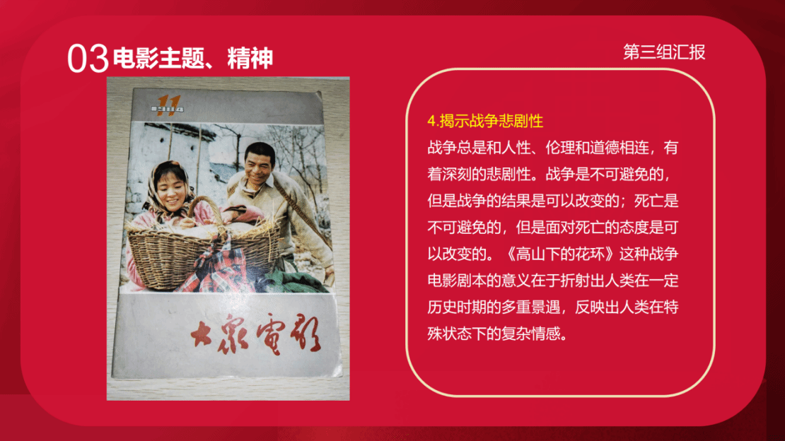 会议伊始,王依诺同志对电影的背景及内容进行简要介绍。该电影改编自李存葆的同名中篇小说《高山下的花环》,故事发生于对越自卫反击战时期。电影塑造了梁三喜、赵蒙生、靳开来等一批个性鲜明的人物,将国家民族的振兴与个人命运巧妙关联。随后,王依诺同志为大家播放了一段视频,加深大家对电影背景的认识。