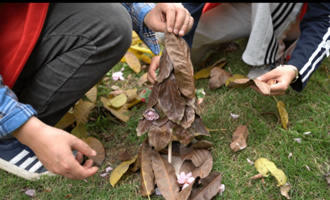 路过几棵枯树时,看到树下散落的枯枝败叶,老师们本能地拿出垃圾夹准备拾取。在拾捡的过程中,党员教师李简瑷感慨道,这些树叶大小不一、造型独特,可以拿回家做成标本。广告学专业的党员教师朱洁表示,大家可以利用这些落叶和枯枝做一个手工艺品,并提出了一个制作方案。大家纷纷表示认同。说干就干,老师们分工合作,有的老师去找形状相对别致的落叶,有的老师去找适合做支柱的树枝,原材料收集好后,老师和学生代表们聚在一起拼接。不一会,一株由枯叶和小枝丫枝搭建而成的“树”便栩栩如生地呈现在众人眼前。枯叶生于树,零落后凭借师生们的手工艺又被赋予了新的“生命”,形成了另一种形式的“树”,这是对自然循环往复、生生不息的最好诠释。学生党员赵翔宇表示,动手制作的过程既是亲近自然、感受自然的过程,也是尊重自然、理解自然的过程。枯叶变废为宝的过程,使我深切体会到资源循环利用的价值。