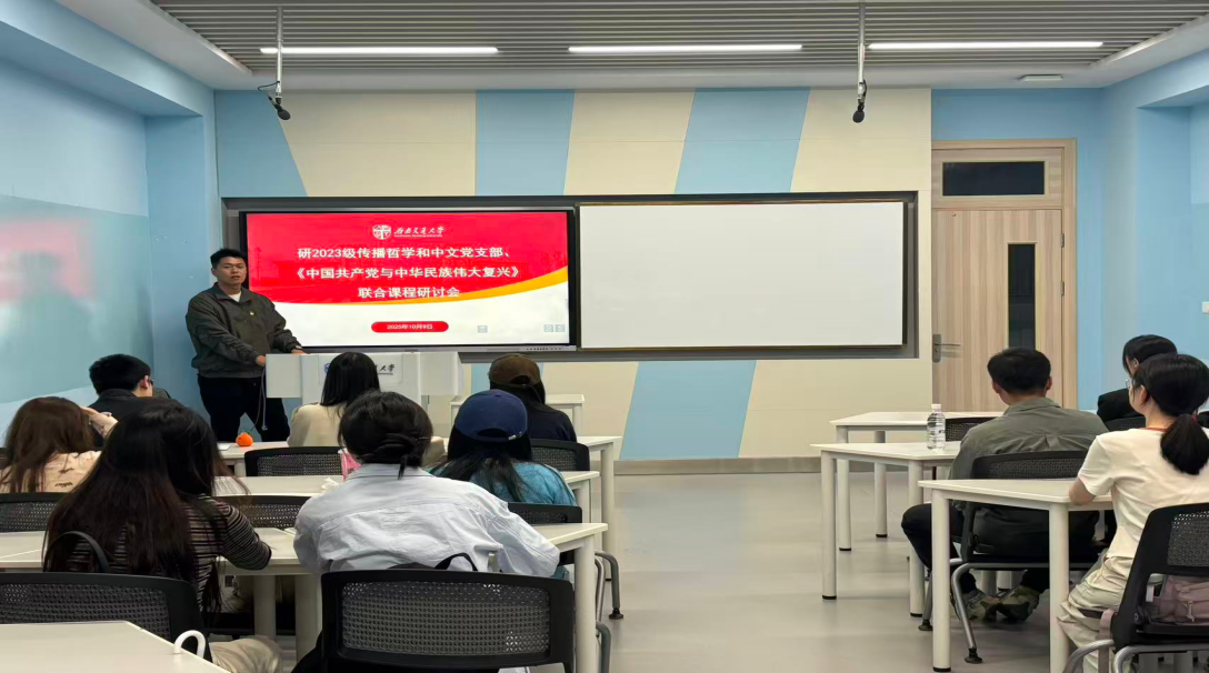 研究生2023级中文党支部与研究生2023级传播哲学党支部在九里校区J4221开展10月主题党日活动,集体观看爱国主义影片《八佰》。此次活动由毛艺霖同志主持,支部全体成员到场学习。