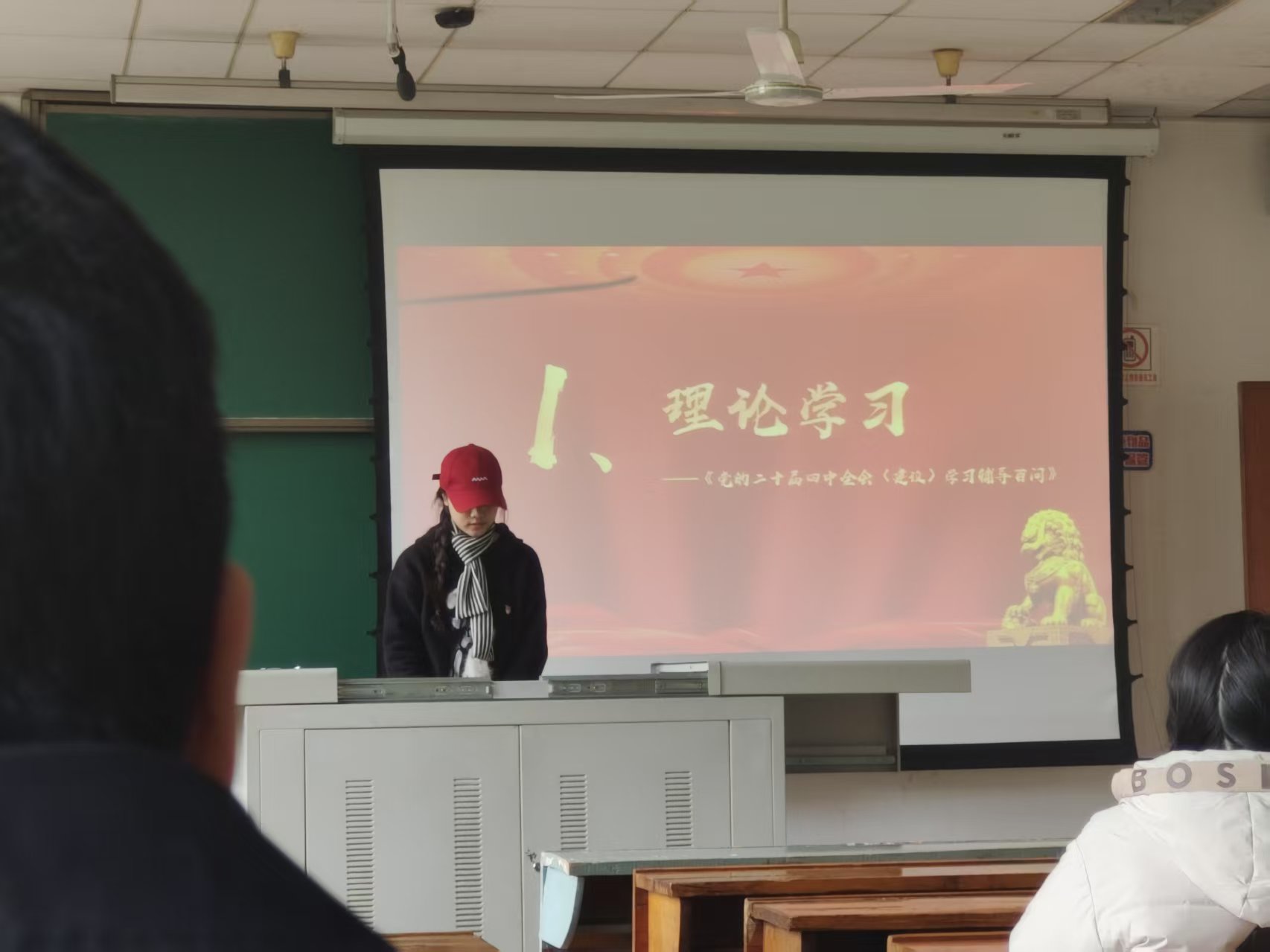 研第一党支部于九里校区J4322教室组织开展12月主题党日活动,围绕《党的二十届四中全会〈建议〉学习辅导百问》进行专题学习。本次活动由满珍明同志主持,研第一党支部全体成员参与。