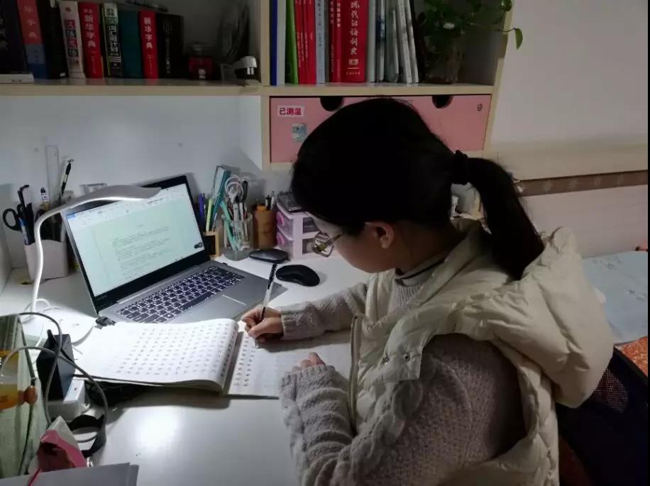 “疫情就是命令,停课不能停学。作为一名预备党员,与其每天在家躺着玩手机,何不边学边做。弟弟上初三了,因为疫情只能在家学习。我一边辅导他学习,一边在旁边学习读书,发展完善自己。”