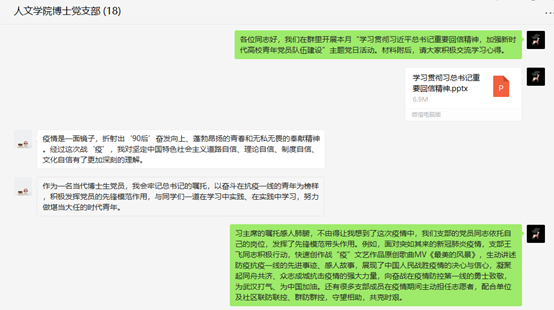 博士党支部在线上进行了主题党日活动。活动主要内容为学习贯彻习近平总书记回信勉励北京大学援鄂医疗队全体“90后”党员的重要回信精神,加强新时代高校青年党员队伍建设。