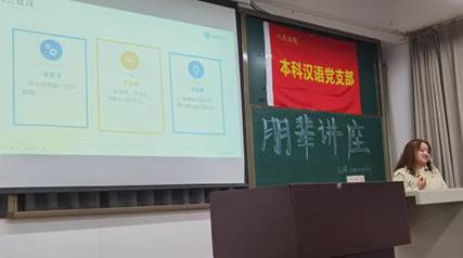 朋辈讲座最后,本科汉语党支部副书记王岚同志总结了此次活动:十分庆幸能初步尝试并搭建起本专业各年级同学沟通交流的平台,由衷希望我们能心怀蹈厉之志、弘扬浩然之气,不忘初心、不负韶华,用奋斗姿态奏响青春强音!
