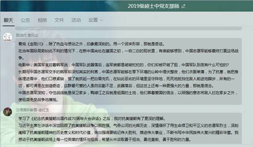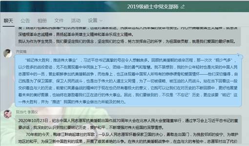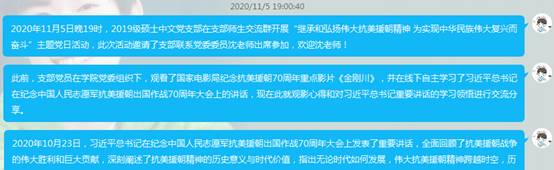 2020年11月5日晚19时,研究生2019级中文党支部在支部师生交流群开展“继承和弘扬伟大抗美援朝精神 为实现中华民族伟大复兴而奋斗”主题党日活动。此次活动由党支部书记何佳主持,邀请支部联系党委委员沈如泉老师出席参加。