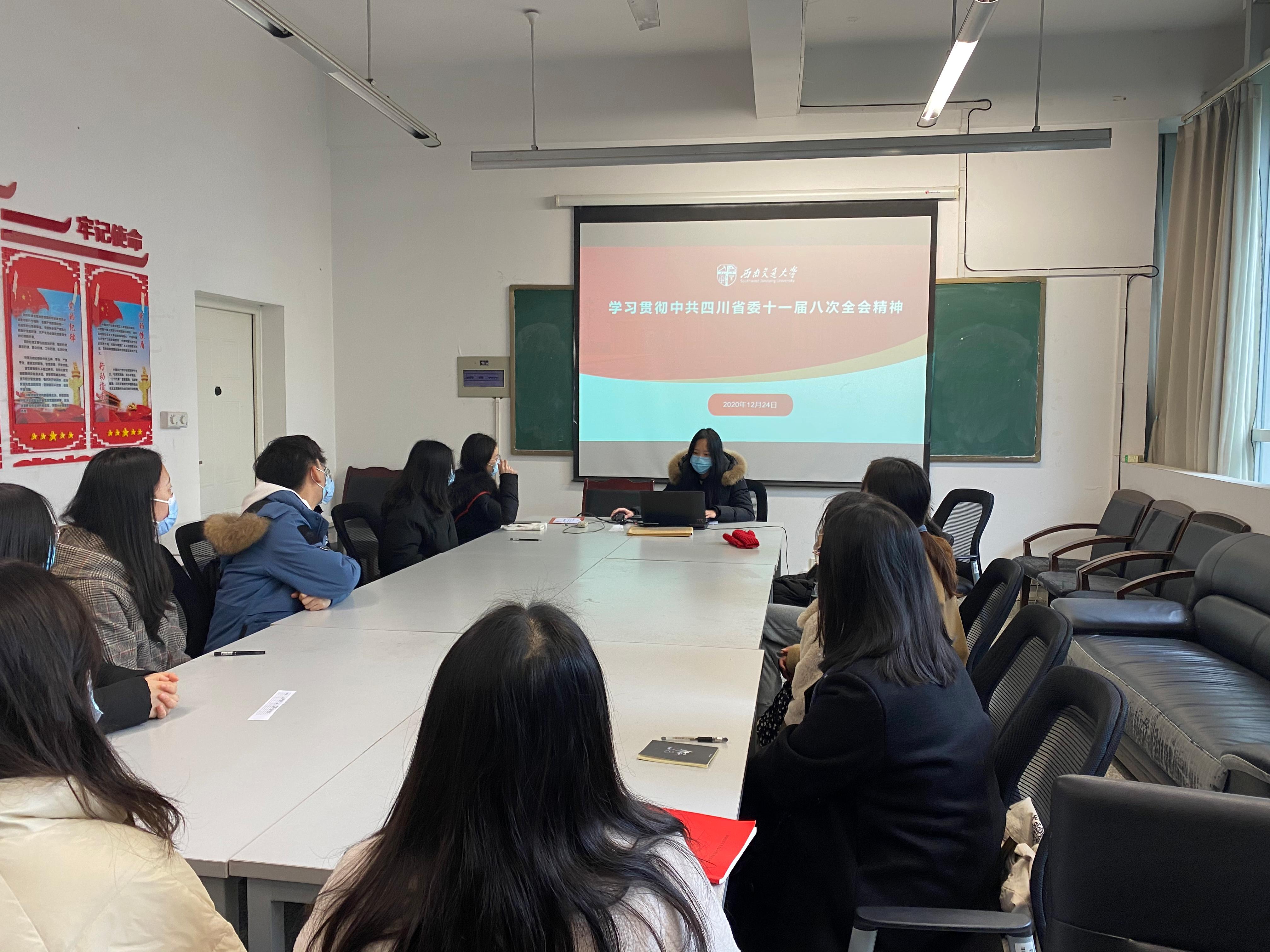 研究生2020级传播哲学党支部开展了“学习贯彻中共四川省委十一届八次全会精神”的主题活动。本次活动全员参与,由党支部组织委员张琬祺担任主持。