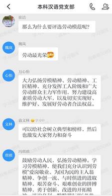 本次线上专题开始时,崔洁同志首先从“为什么评选劳模”、“怎么评选劳模”、“劳模事迹分享”三个方面着手,引导支部成员了解评选劳动模范的流程,同志们阅读先进劳模事迹,透过具体事例理解“劳动最光荣”的意义。劳模精神、劳动精神、工匠精神都是以爱国主义为核心的民族精神和以改革创新为核心的时代精神的生动体现,是鼓舞全党全国各族人民风雨无阻、勇敢前进的强大精神动力,表彰劳模精神、树立模范,有利于我们树立“爱岗敬业、为国为民”的主人翁精神,为社会主义现代化建设做出自己的贡献。