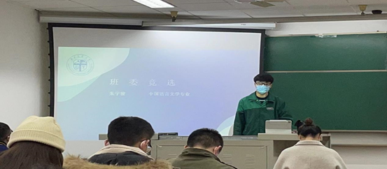 随后,为增强班级管理活力,调动多数同学参与班级事务的积极性,经老师和班委商议,本学期进行班委轮岗制度,让更多同学参与到班委工作当中。经过竞选演讲和班级投票,由朱宇骏任班长,叶锦怡任副班长,郭莹莹任团支书。新一届班委成员表示将不辜负老师和同学们的信任,在未来的工作中不忘初心,砥砺前行,和全班同学一起建设好研2021级中文班。