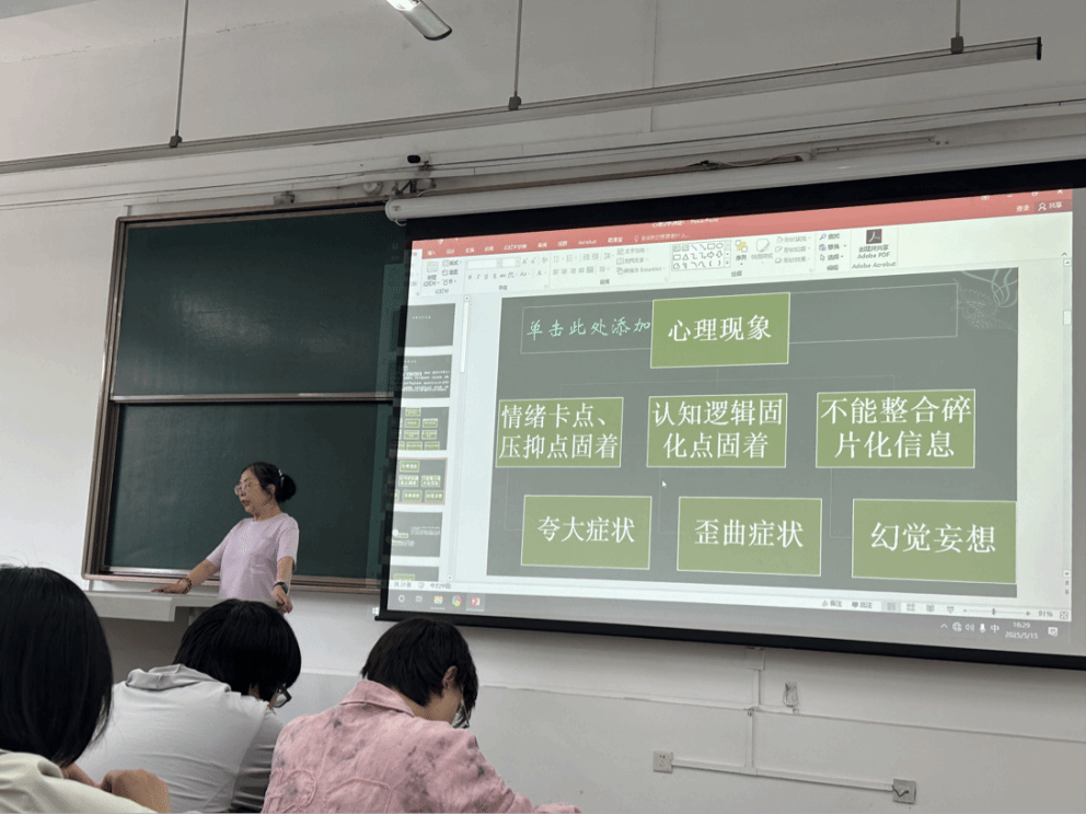 在讲座尾声,曾老师从心理病理学的视角出发,简要讲解了幻觉、妄想和夸大三种症状的核心特征,并强调:虽然这些术语多见于临床心理学,但在正常人的生活中,也可能出现轻度的“类幻觉”或“类妄想”状态。 她呼吁大家学会将碎片化的经验整合起来,重建一个多元、包容而真实的自我图景。