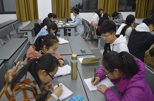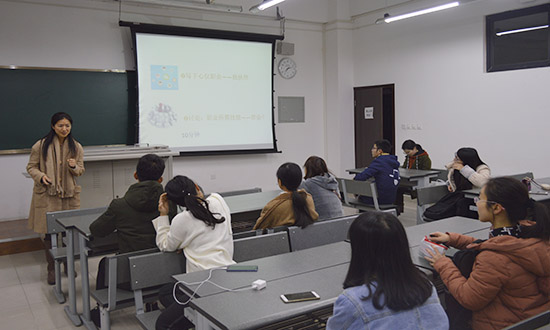彭老师首先简单介绍了求职者的必备的三种素养——知识、技能、品格,并随即阐释了这三种必备素养的重要性。接下来,彭老师以小组作业的方式,要求同学们将自己理想的职业和从事该种职业所需的职业素养写在一张纸上,并根据自己的理想职业寻找和自己具有同样追求的同学。之后,以小组为单位讨论从事该种职业所需的职业素养,彭老师亲切地同各小组进行交流,现场气氛十分热烈。