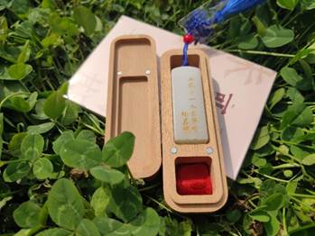 学院为学生准备的第三件礼物,是一方印章,这项礼物是硕士毕业生的专属纪念。印章为长方体形状,通体采用纯白类玉石材质,侧面是“二零二一色小说