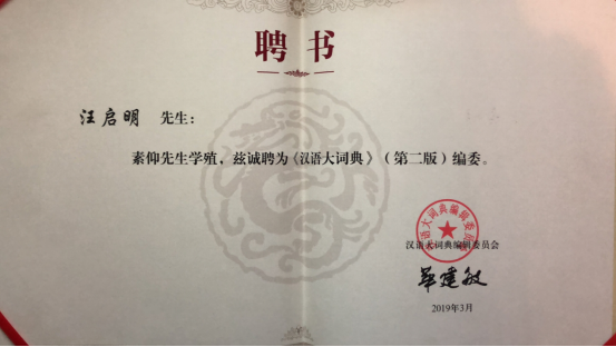时任全国人大常委会副委员长、《汉语大词典》(第二版)主编华建敏为我校汪启明教授颁发的编委证书
