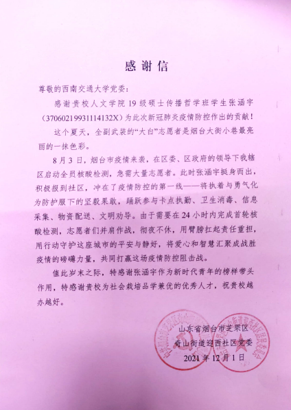 近日,色小说 党委收到来自山东省烟台市芝罘区奇山街道迎西社区党委发来的感谢信,信中对色小说 2019级硕士传播哲学班张涵宇同学积极参与新冠肺炎疫情防控志愿服务表示感谢。
