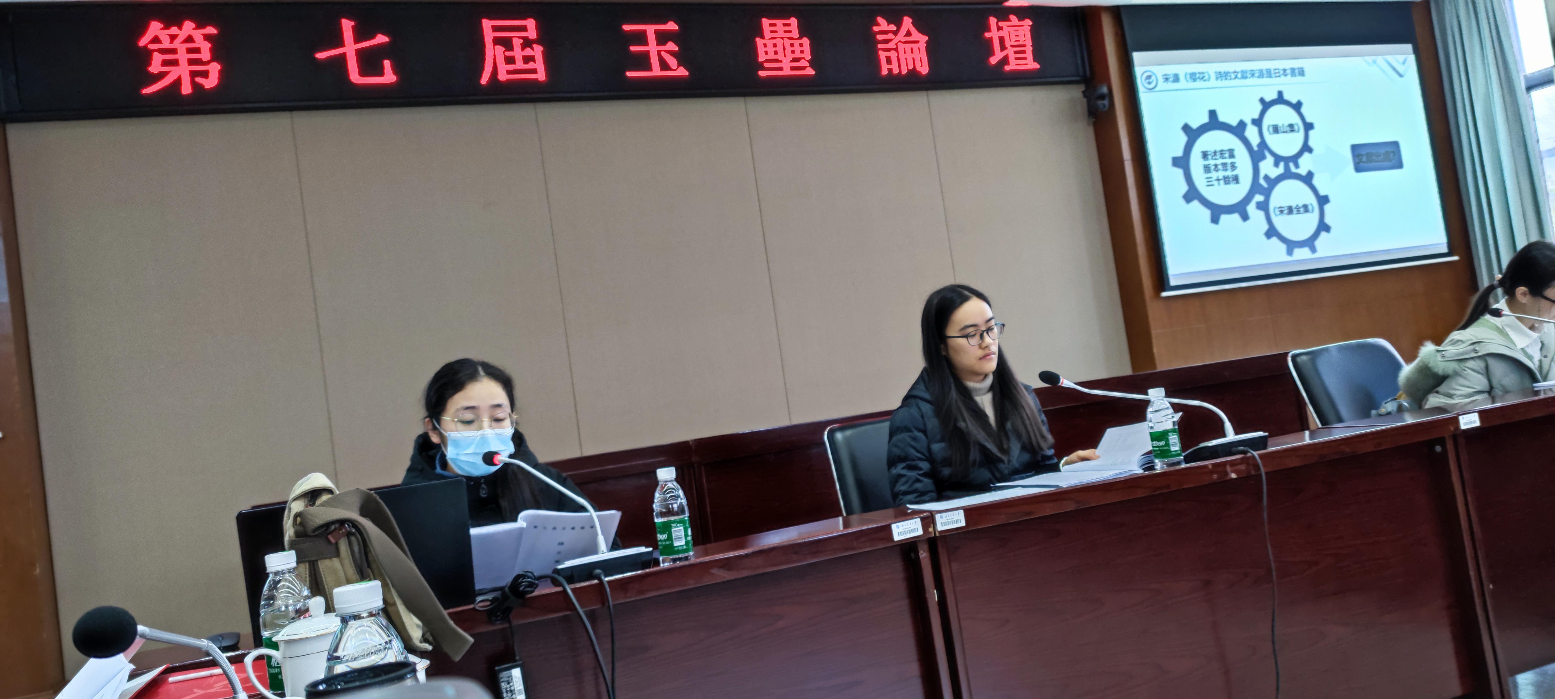 的罗宁、刘玉珺、段莉萍、唐新梅、周芳、李栋、赵旭,四川大学周裕锴、张朝富、戴路、陶熠,四川师范大学张海、阮怡,对每一篇论文进行了点评。我校研究生何佳报告了《〈宋艺圃集〉与〈石仓宋诗选〉选黄庭坚诗之比较研究》,郭姣报告了《宋濂〈樱花〉诗证伪》,何迪报告了《敦煌通俗小说中的鬼神叙事》,刘亚琼报告了《域外儒学传播视域下的越南阮朝童蒙教育》,共四篇论文。李子璇、张绍香、毕桂苓、赵越作为评议人评议了川师、川大同学的论文。整个会议中,报告人发言精彩,评议人准备充分,师生共同参与了热烈的学术讨论。报告人由此发现了论文的不足之处,开拓思路,获取新知。评议人从中学习到撰写论文的方法思路,吸取经验教训。旁听同学的收获也很丰富,不仅接触到新的学术信息和观点,更感受到学术研究的魅力和意义。会议最后,刘玉珺老师和周裕锴老师分别对此次会议进行了总结,张朝富老师肯定了玉垒论坛对于促进研究生学术交流的意义和价值,欢迎老师和同学们明年到四川大学再聚。