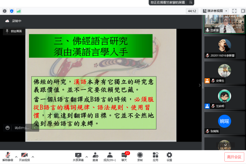 接下来,竺家宁教授介绍了佛经语言里独特有趣的语言现象,并深入探寻这些现象出现的原因,从中总结出佛经语言中的一些规律。除此,竺家宁教授还辨析了佛经语言中一些词的词义。他通过相关故事引入,讲授深入浅出、妙趣横生,为听众展现了佛经语言的别样魅力。讲座最后,竺家宁教授强调:声韵学自古是佛门的基础功夫。再次呼吁现代知识分子,要学会活用声韵学,方能深入挖掘佛家语言和思想深刻价值。