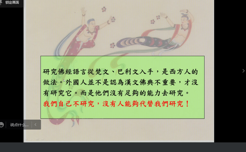 讲座以佛经语言研究的意义与方法为主题。竺家宁教授从自身研究体验引入,向听众介绍了佛经研究的多种方向,并强调本次讲座是为了向听众介绍文学的佛经、语言的佛经,让听众在佛经语言中领略佛学魅力。竺家宁教授还阐释了佛经语言学的目的、意义和必要性,他指出佛经语言是中古汉语的丰富的语料库,研究佛经语言能让我们更好地了解中古汉语的面貌,并强调佛经是一千年前的口语,研究佛经时应注意语言的发展变化。