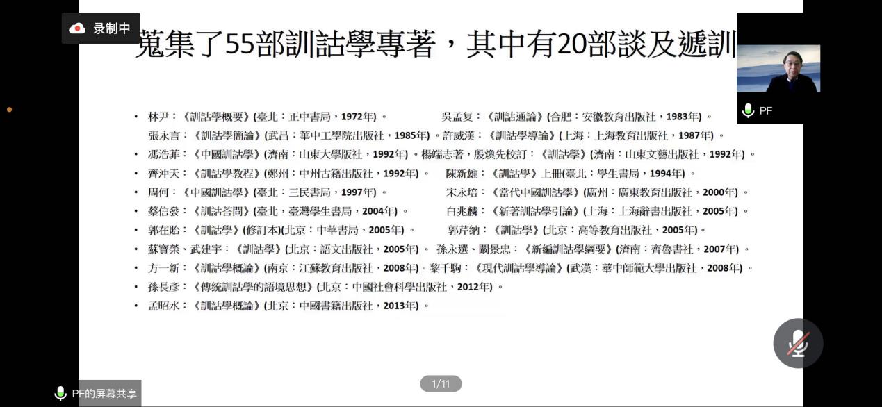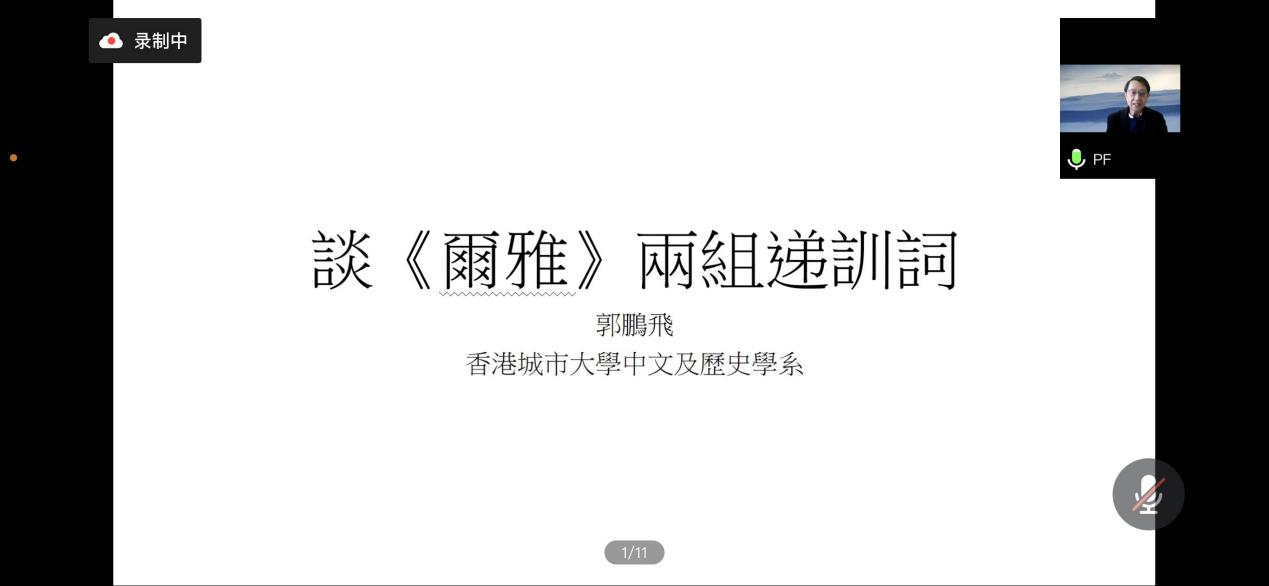 本次讲座以《谈<尔雅>两组递训词》为主题,郭教授先为听众列举出近六十部训诂学著作,介绍里面谈及递训的部分,以此来说明递训学所处的重要位置,为大家进一步了解递训奠定了的基础。