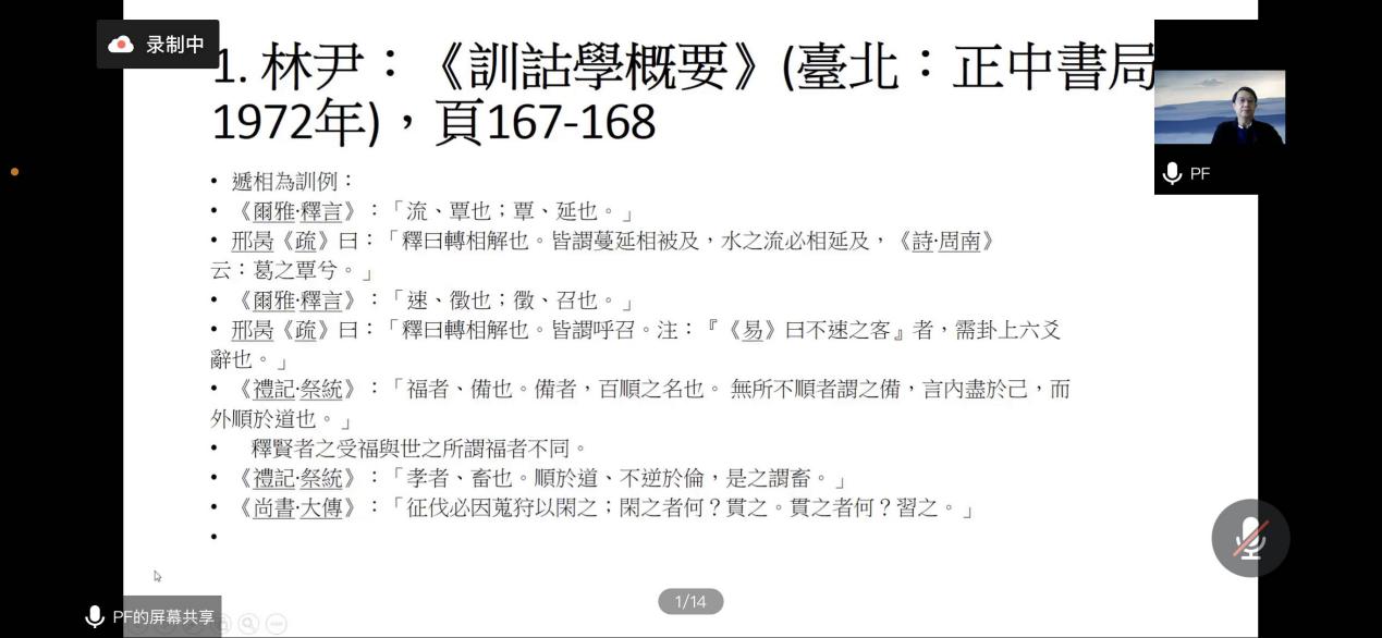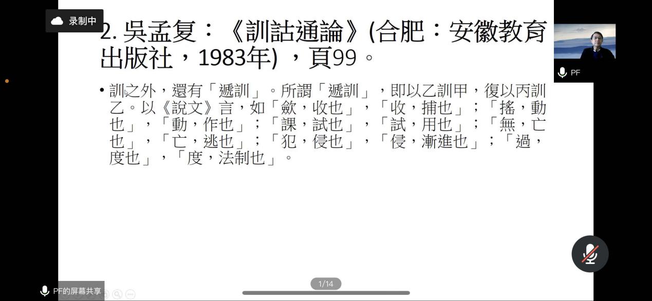 接着,郭教授以林尹的《训诂学概要》、吴孟复的《训诂通论》以及张永言的《训诂学简论》等重要训诂学著作为例,抽丝剥茧出重要的递训成分,从定义以及各部著作的具体内容切入,多角度详细为我们介绍了递训。