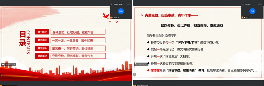 坚持节俭教育和劳动实践相结合,辅导员借助习近平总书记的勤俭奋斗事迹、以“毕生的梦想,就是让所有的人远离饥饿”的杂交水稻专家袁隆平的故事、李子柒制作的《水稻的一生》等内容开展节俭教育,帮助新生切实体会生活的来之不易;动员同学身体力行,参加“四个一”活动,投身劳动实践,立志做有理想、敢担当、能吃苦、肯奋斗的时代好青年。
