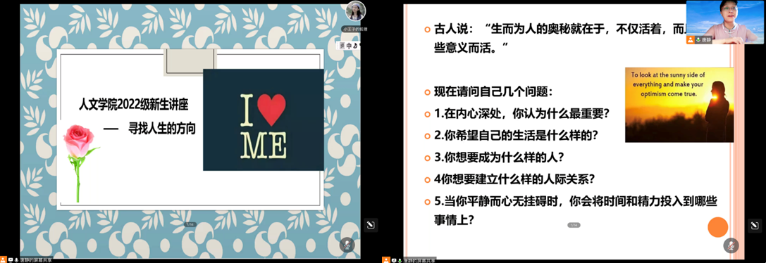 组织开展专题讲座、心理健康测试等活动,积极开展新冠肺炎疫情防控教育、心理健康教育。建立新生个人心理健康档案,及时了解和掌握新生的心理动态;邀请心理研究与咨询中心唐静老师开展“寻找人生方向”新生心理适应线上讲座,帮助新生保持积极健康稳定的学习心态。