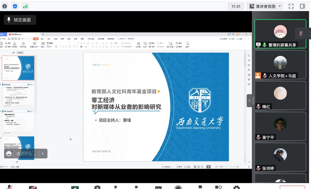 在新闻传播组的答辩会上,蒋宁平教授展示了自己主持的四川省社科规划项目“社交媒体中的城市形象:以‘微成都’对成都形象的建构与传播为例”的结项成果;安燕教授分享了自己主持的国家社科基金艺术学项目“中国电影思想史(1905-1949)”的阶段性成果;曹璞老师汇报了自己主持的教育部人文社科青年项目“零工经济对新媒体从业者的影响研究”和四川省社科规划青年项目“融媒时代书店空间中的具身实践对成都城市形象传播的影响研究”的阶段性成果;张诗婷老师报告了自己主持的三个四川省社会科学重点基地项目“MOA视角下大学生的社交媒体使用与意见表达调查分析”、“生态美学视角下川酒品牌跨媒介传播研究”、“动漫广告跨媒介叙事的生态美学研究”各自的成果;马超老师就自己主持的教育部人文社科青年项目“算法推荐时代西部留守儿童社交媒体沉迷的发生机制及协同治理研究”和四川省社会科学重点基地项目“数字技术赋能四川乡村公共服务精细化治理的体系建构研究”的进展情况进行了介绍;李俊鹏博士展示了其主持的教育部人文社科青年项目“新世纪以来美国影像中的中国形象及意识形态传播效应研究”的研究进展。