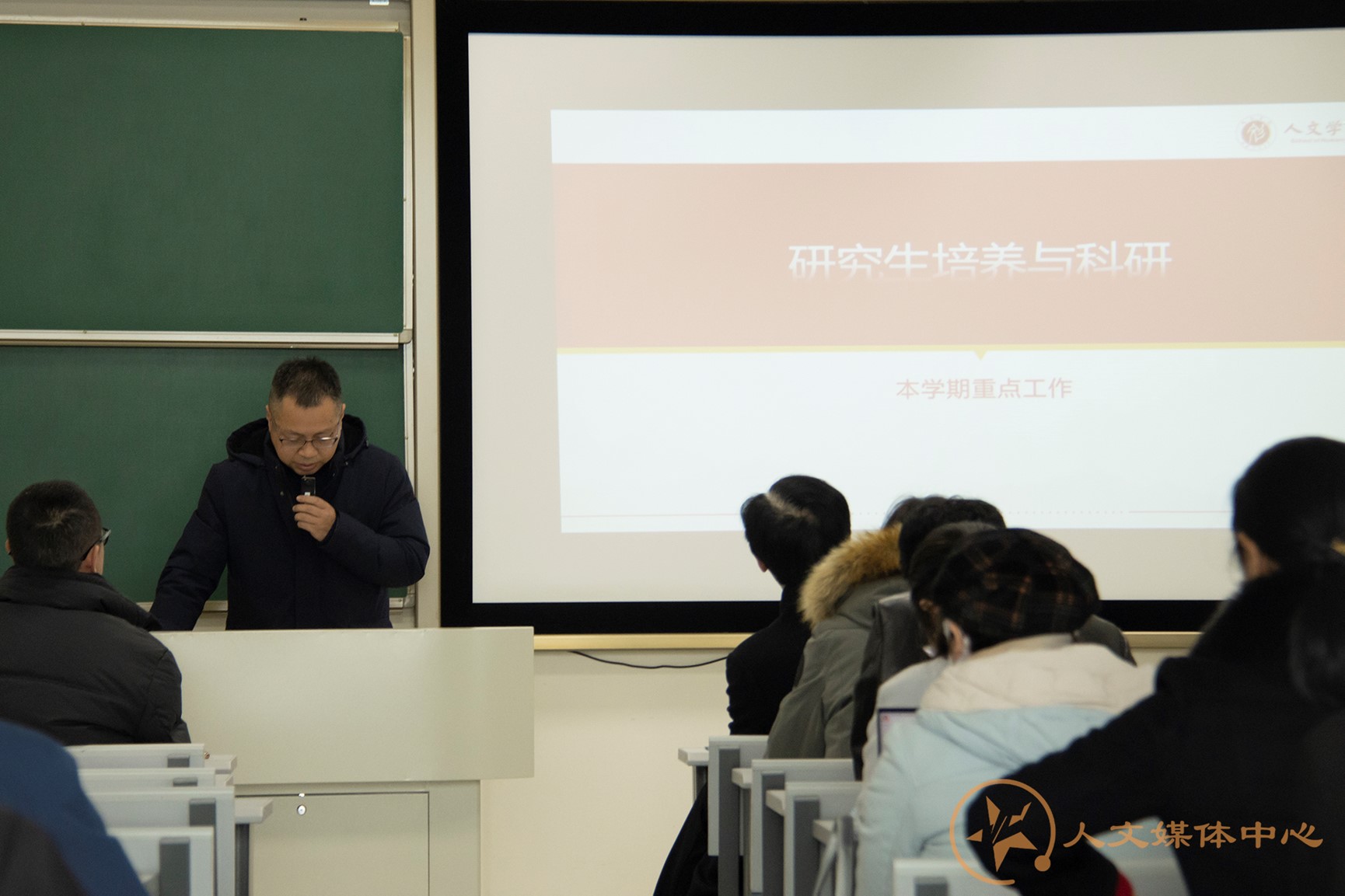 随后,刘院长进行新学期行政工作部署。他提出“主动谋划、水滴石穿、以量变促质变”的工作原则,并强调以“学科建设”为全院的工作重点。随后在人才师资队伍建设、教学工作、科研工作、内部管理工作方面进行具体的部署。沈如泉副院长和胡红副院长分别对研究生培养和本科教学工作进行了本学期工作的重点提示。