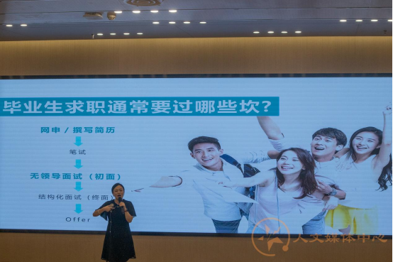 首先,易老师用年轻人拜佛的生动现实案例引出当下年轻人的压力与焦虑问题,并通过一些具体数据进一步展示当前就业面临困难的现状。由此,她提出了毕业生求职需要迈过的几道坎,并重点围绕简历撰写和面试两个方面展开。