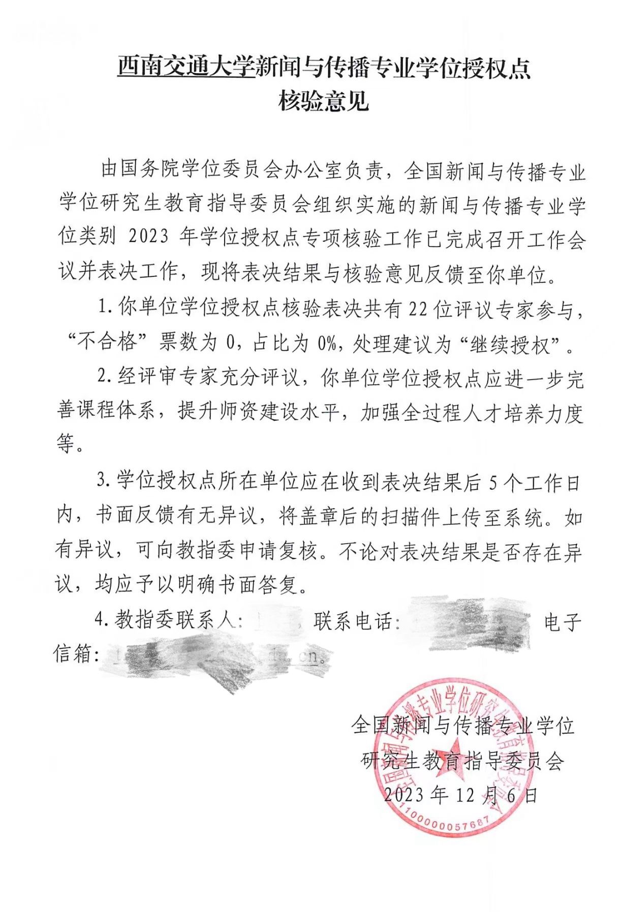 新闻与传播学位授权点核验结果为全票通过,可继续行使学位授权。