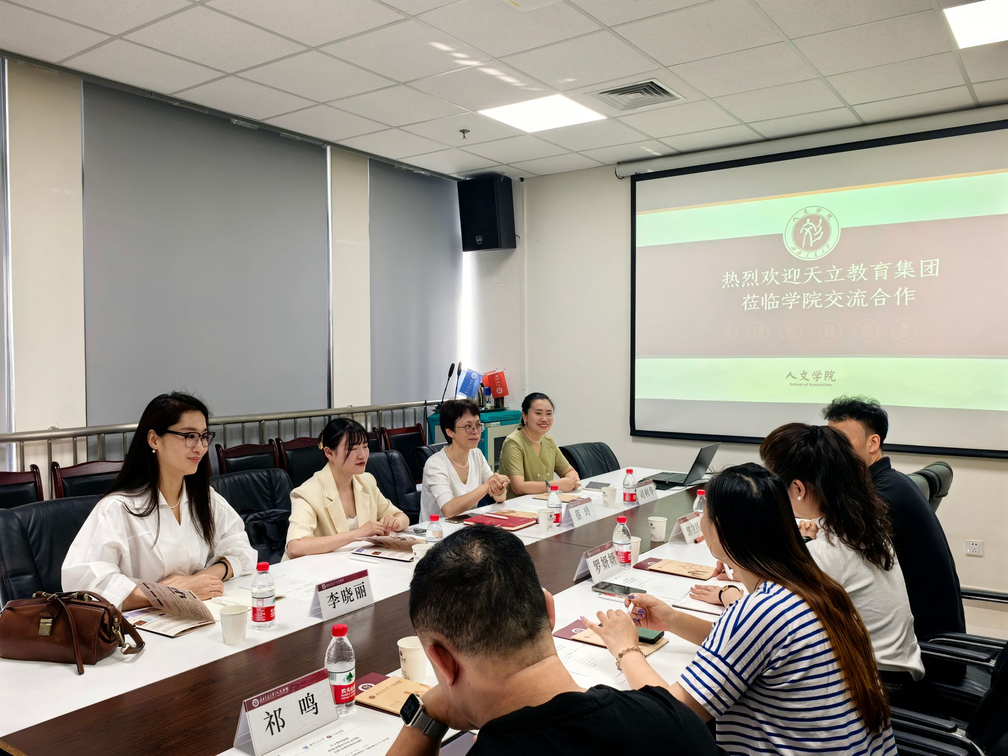 近日,天立教育集团天天臻学分公司EMCN蔡玲、全媒体运营总监李雪薇、人事行政总监司利华、招聘经理李晓丽等一行到院洽谈合作。学院党委书记罗妍妍、党委副书记郭立昌、职业生涯规划导师杨子仪、综合办主任王燕、教学支持与培训中心主任祁鸣参加会议。
