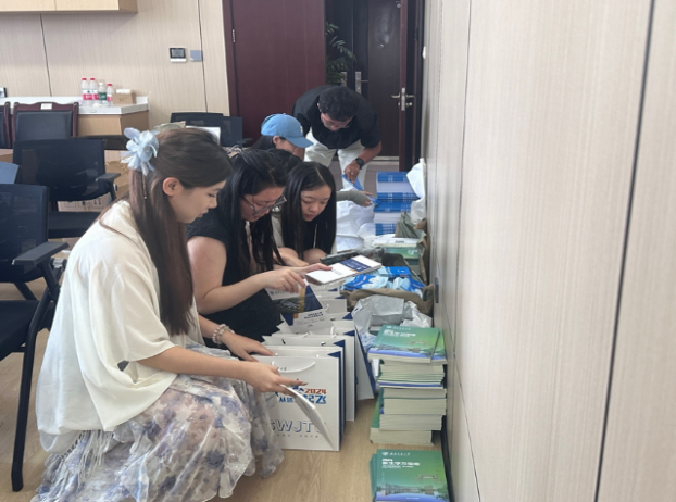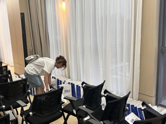 迎新工作筹备会。学院团委书记刘爽老师、新生辅导员朱思颖老师、团委学生干部、2024级新生班协以及迎新志愿者参加了此次筹备会。团委学生干部、班协以及志愿者在朱思颖老师的指导下开始忙碌地开展筹备工作。从搬运新生入学相关物资并整齐装袋到精心布置色小说