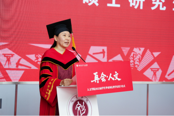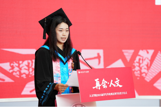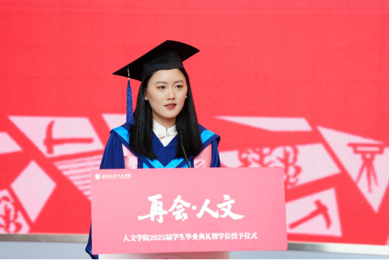 本科毕业生代表传播学专业任世琴同学发言。她将人文思考与体育坚韧结合,不仅在课程和社会实践中积极践行人文精神,更在体育赛场上展现出辉煌成就——曾获全国大学生田径锦标赛女子100米、200米双冠军,打破学校纪录,带领西南交大时隔23年再次获得全国冠军。她祝福同学们带着那份“无畏出发”的勇气,去创造各自的辉煌人生。