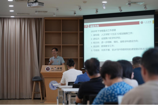 2025年“下半篇”》为题,系统总结了2025年上半年学院工作成效,并围绕新学期工作重点进行部署。刘院长指出,学院持续推进“一融双高”建设,强化党建引领,统筹推进党风政风、师德师风、院风学风建设,营造良好育人生态。在学科建设方面,中国语言文学一级学科博士学位授予点周期性合格评估全票通过,学科结构持续优化,高层次学术会议有效助推学科发展。科研方面,国社科基金立项、人才称号与教师晋升等工作稳步推进。学院还持续深化校地合作,拓展国际交流,为发展注入新动力。