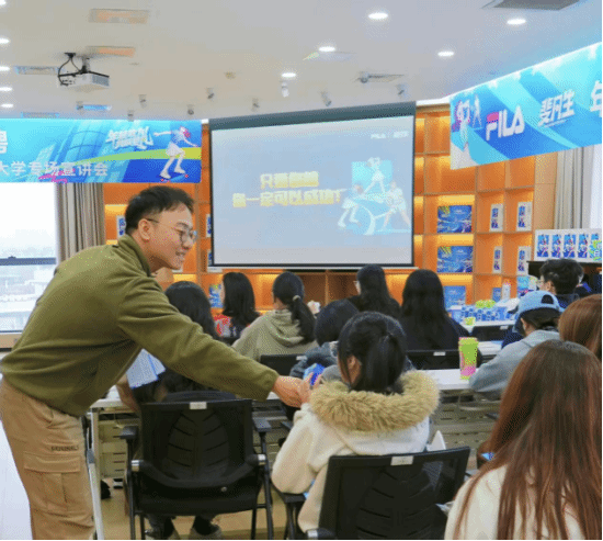 随后,FILA西区人力资源部经理王胜男登台分享。她从当前大学生普遍关注的职业选择出发,深入剖析中国体育用品行业的广阔前景,并聚焦FILA品牌的稳健发展与独特竞争力,将个人发展与行业前景紧密结合,详细解读了“斐凡生”品牌的培养体系、薪酬结构与人文关怀,强调FILA对高素质人才的重视与投入。现场同学们积极响应,互动环节气氛热烈。