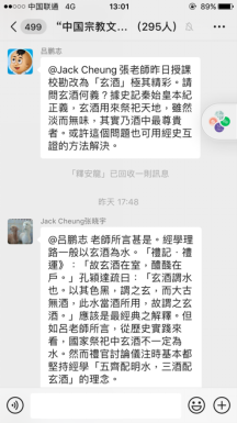 此外,在课程群里,吕教授又与张老师从经史互证的角度探讨了“玄酒”的义涵。吕老师认为,据《史记·秦始皇本纪》正义,玄酒用来祭祀天地,虽然淡而无味,其实乃酒中最尊贵者。张老师肯定了吕老师的看法,从历史实践来看,国家祭祀中玄酒不一定为水。不过,经学理路一般以玄酒为水,如《礼记·礼运》:“故玄酒在室,醴盏在户。”孔颖达疏曰:“玄酒谓水也。以其色黑,谓之玄,而大古无酒,此水当酒所用,故谓之玄酒。”礼官讨论仪注时基本都坚持经学“五齐配明水,三酒配玄酒”的理念。日本学者江川式部有一篇专文讨论唐朝玄酒明水在国家祭祀中的实践。江川先生根据贾疏,提出唐人习惯以井水为玄酒,这也符合经史互证之理。为进一步了解酒在仪式中的作用,吕鹏志教授还在群里分享了他的长篇论文《早期道教醮仪及其流变考索》,此文所说的“醮”是儒、道二教共有的敬酒礼仪。
